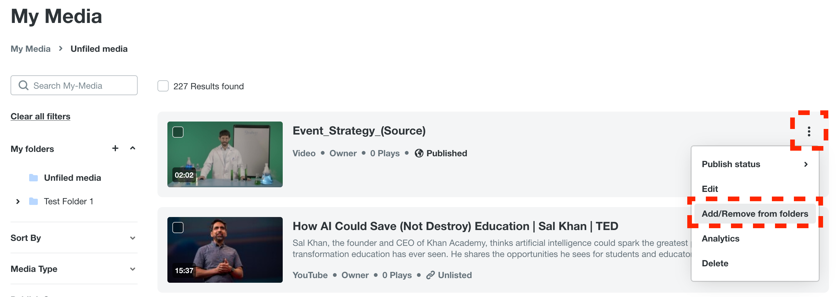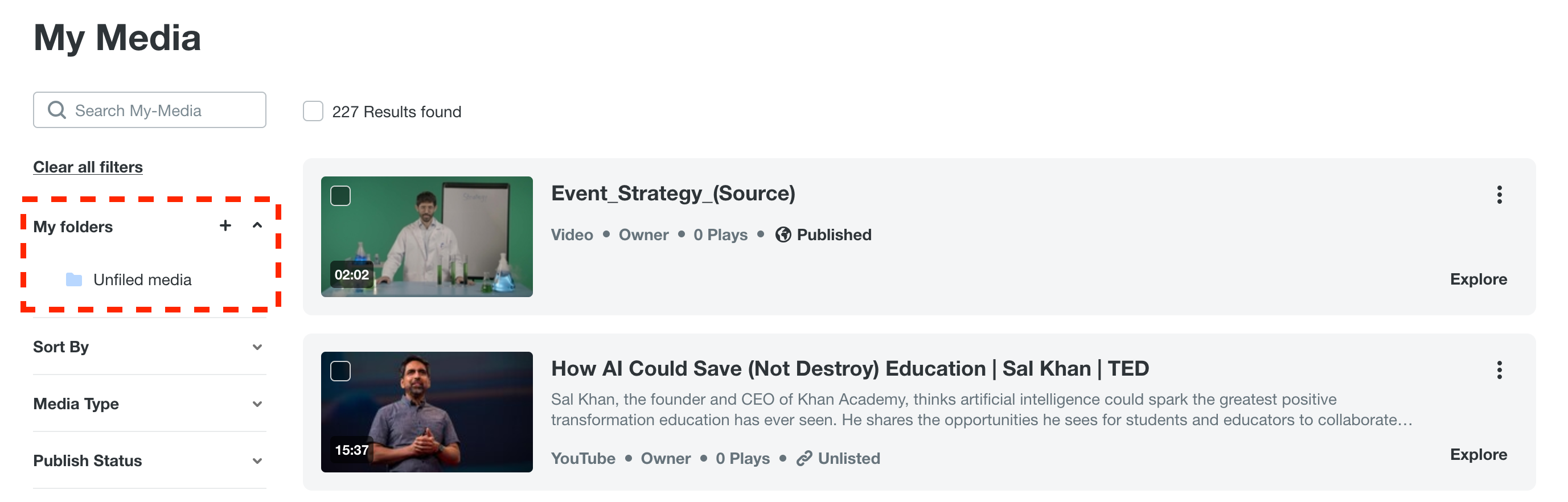 In the My Media page, you’ll see a My folders section at the top left above the sorting filters. You will also see a Unfiled media folder. This folder is a default folder created automatically that shows all media items not yet organized into a folder. As you organize your media into folders, those items will no longer appear in Unfiled media.