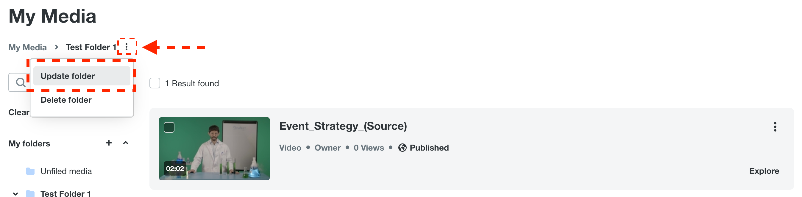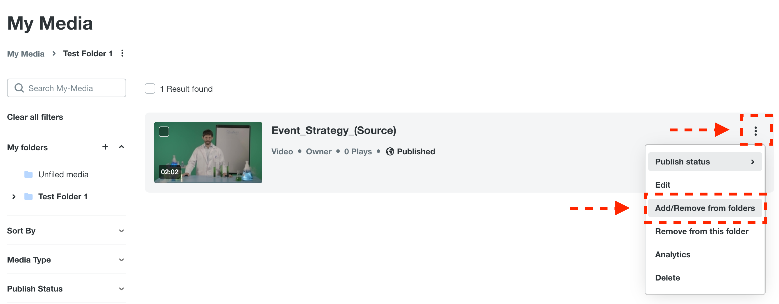 The usual search function will become context specific once you’ve navigated to a folder. It will act like a search for the specific folder you’re currently in instead of a global search of all your media. Use the search bar at the top of My Media to find media within the folder you’ve opened. All the usual filters, like media type, owner, etc. still work, and apply to the selected folder (and its subfolders).