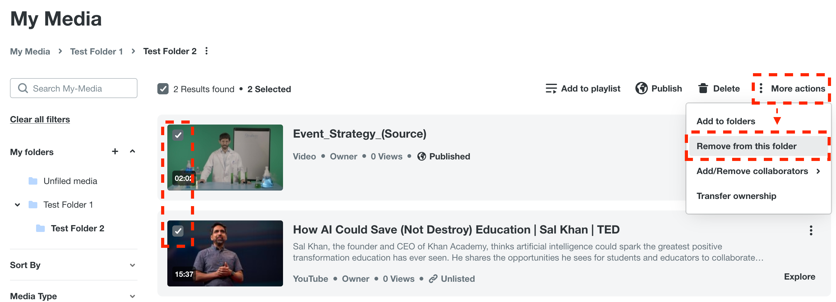 On the My Media page, drag and drop a single item into the desired folder. To move more than one item, select them using the check boxes, then drag and drop into the folder. A smaller thumbnail will appear when dragging to a folder. A green pop up window will appear to confirm the video has been moved into a folder.